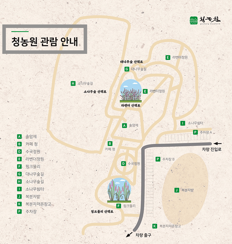 - 주차장 3개소: 청농원 입구, 라벤더 가든 인근, 대형 주차장(버스·단체 가능)
