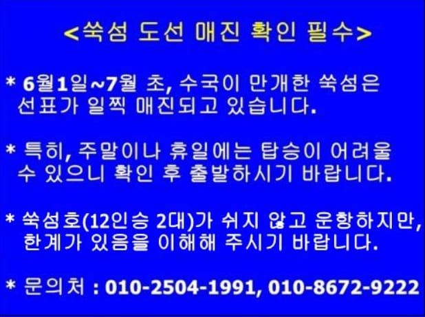 - 배 종류: 14인승 쑥섬호 2척(쑥섬 1호, 쑥섬 2호)