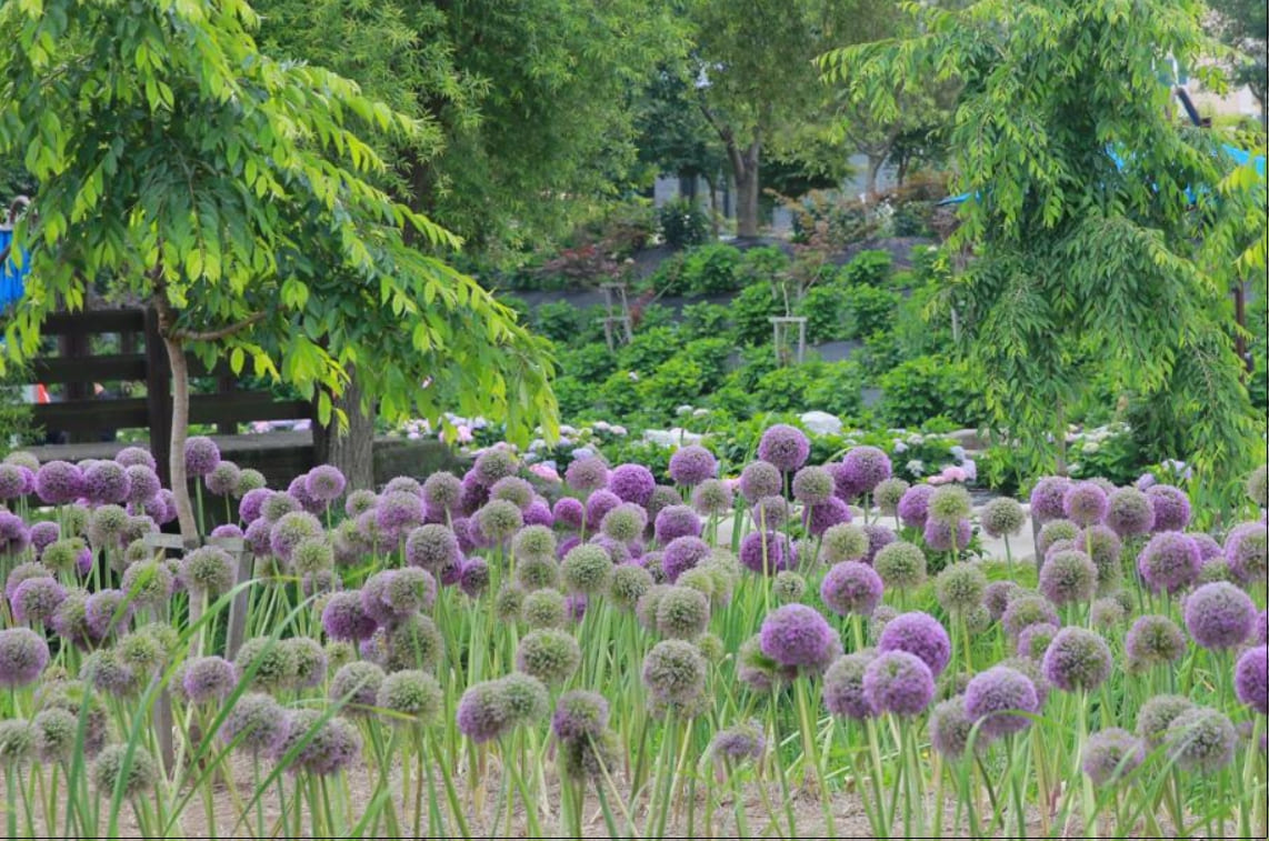 - 능수벚나무, 작약, 수선화, 코끼리마늘꽃 등 다양한 계절 꽃들이 어우러져 자연 정원의 풍성함을 더합니다.