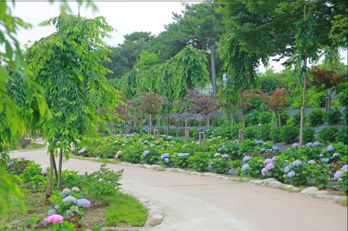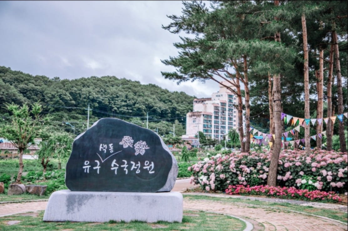 - 특징: 약 1km 구간 유구천을 따라 22종 1만 6천여 본의 수국이 조성된 전국 최대 규모의 수국정원
