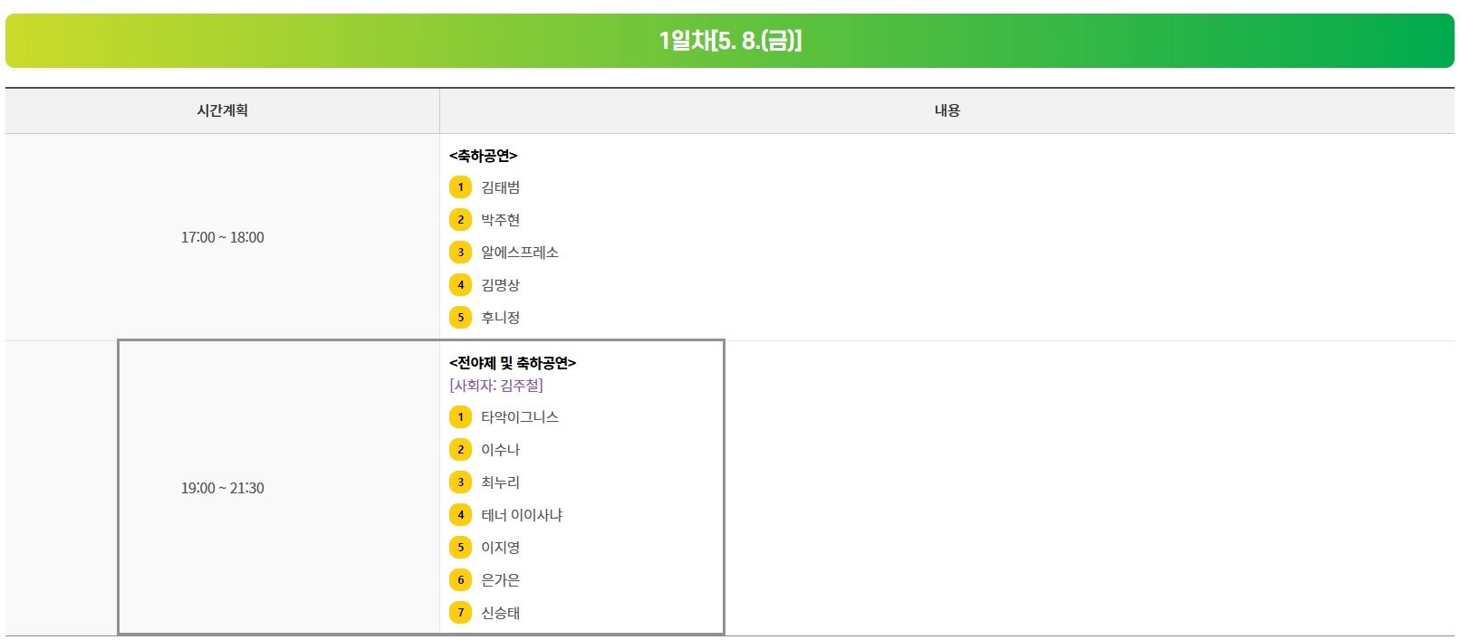 - 낮 공연 : 국악 / 청소년 페스티벌