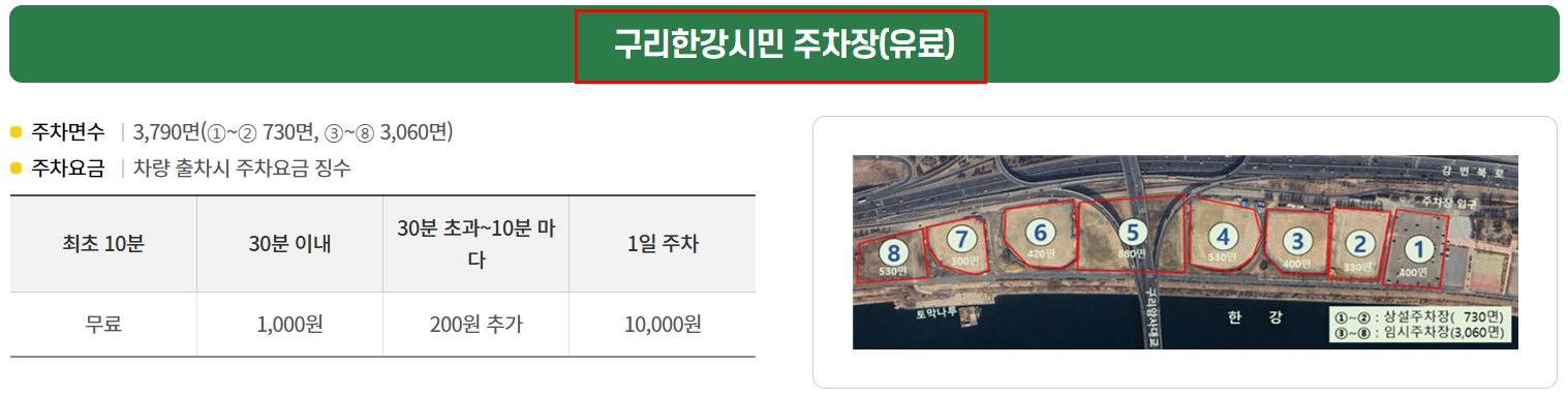 A. 구리한강시민공원 주차장을 포함해 약 3,700면 이상 운영되지만 주말 오후에는 매우 혼잡합니다.
