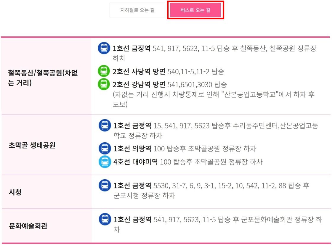 군포 철쭉축제기간에는 다양한 버스 노선도 이용 가능합니다.