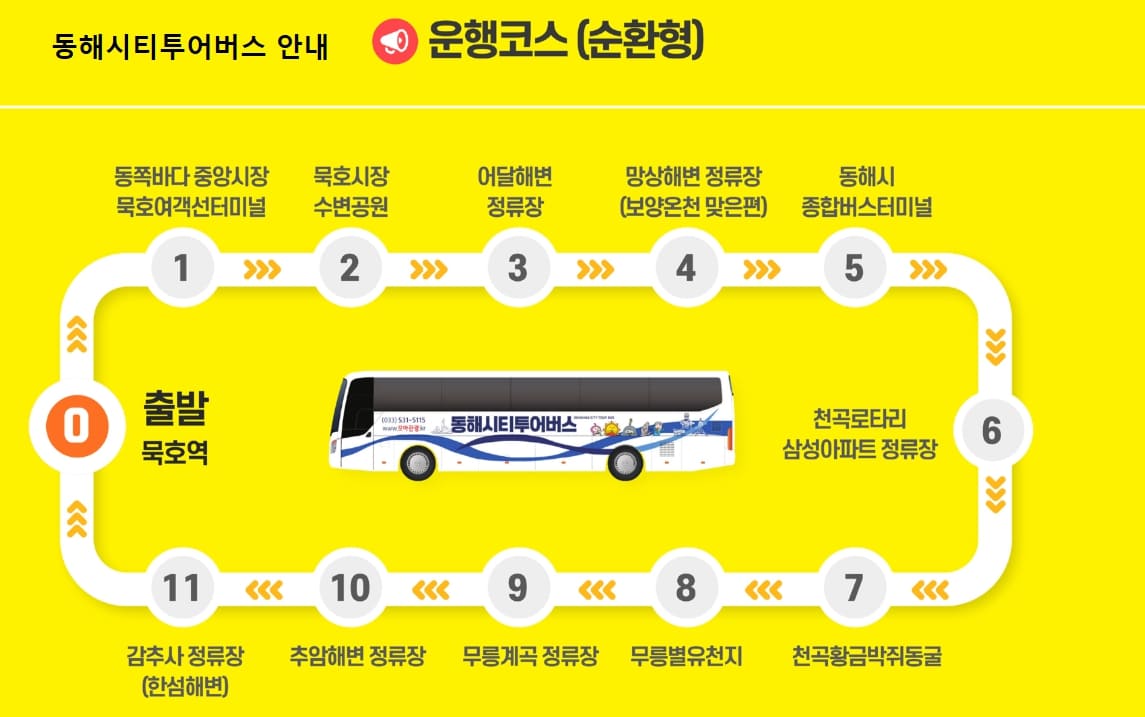 자가용 없이도 동해 주요 명소를 함께 둘러볼 수 있는 시티투어버스 이용은 매우 효율적입니다.