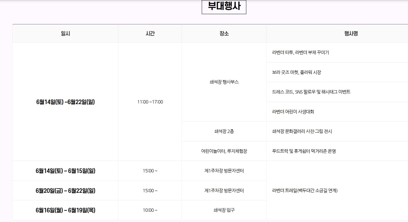 또한 플리마켓, 라벤더 굿즈 마켓, 로컬 푸드 트럭이 함께 운영되어 볼거리, 먹을거리, 살 거리가 모두 갖춰진 종합 문화축제 형태로 구성되어 있습니다.
