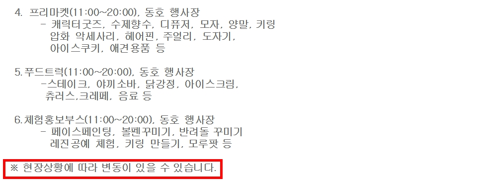 푸드트럭은 동호 행사장 중심으로 운영되며, 저녁 시간대에는 대기 줄이 길어질 수 있습니다.