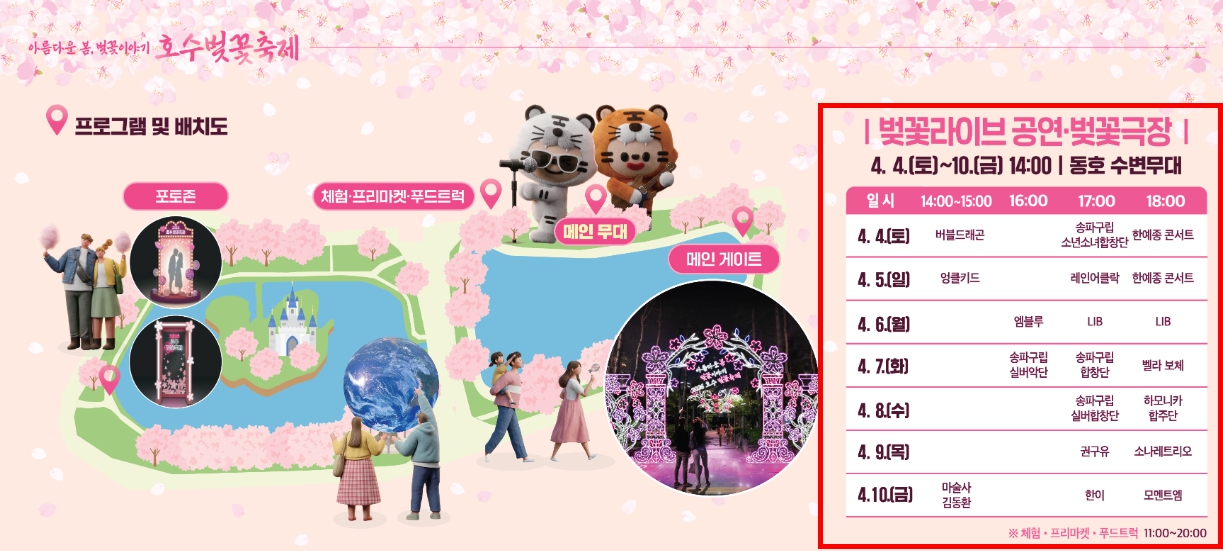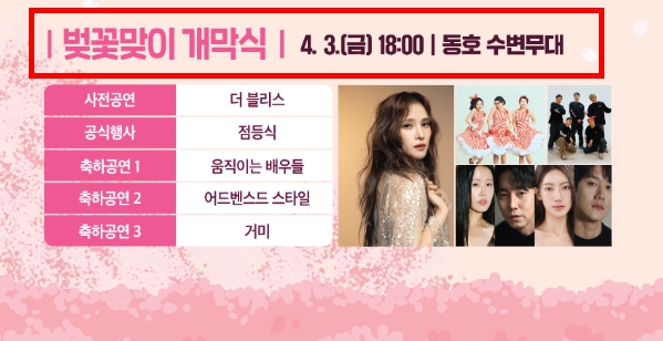 - 개막식: 4월 3일 18:00 (동호 수변무대)