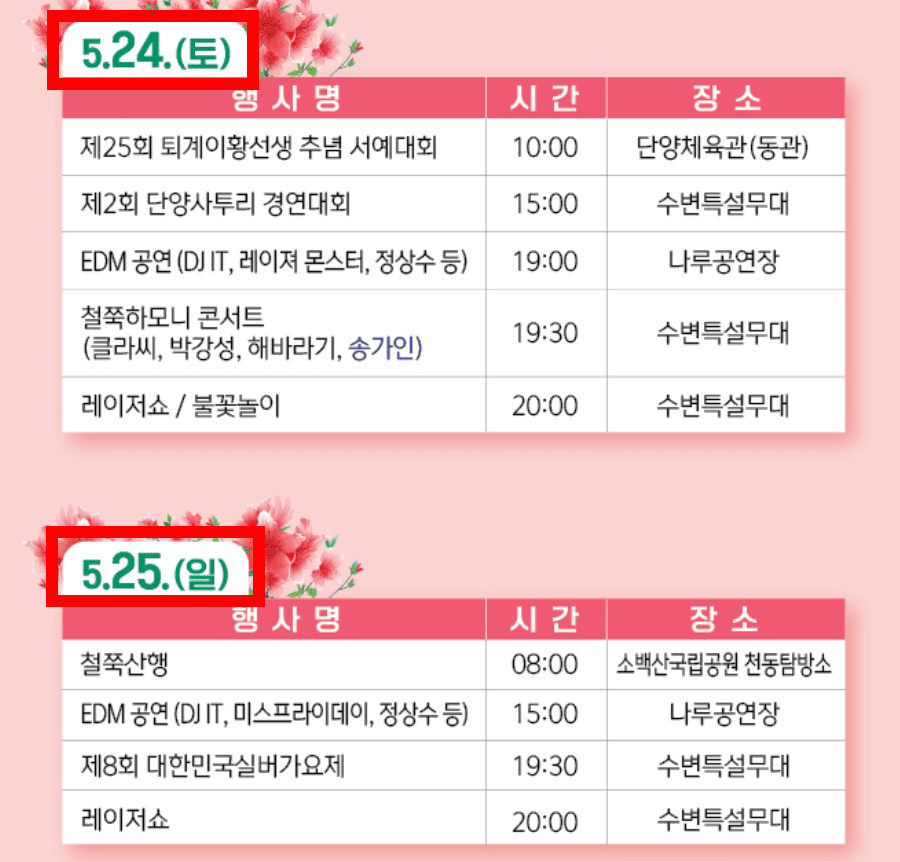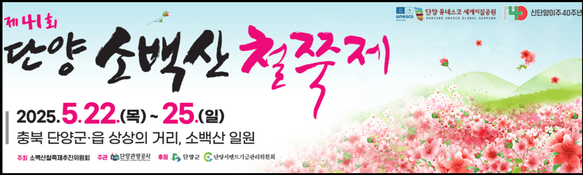 | 단양 소백산 철쭉제 | 2025.5.22~5.25 | 충북 단양군 단양읍 상상의 거리, 소백산 일원 | 산신제, EDM·가요제, 초대가수 공연, 체험행사, 먹거리 |