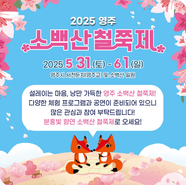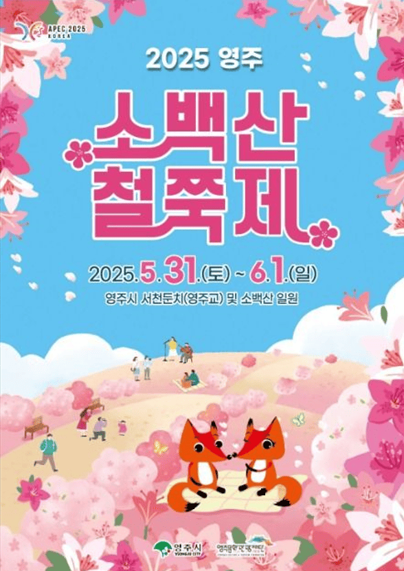 | 영주 소백산 철쭉제 | 2025.5.31~6.1 | 경북 영주시 서천둔치(영주교), 소백산 일원 | 피크닉 콘서트, 버스킹, 체험, 개막식, 축하공연 등 |