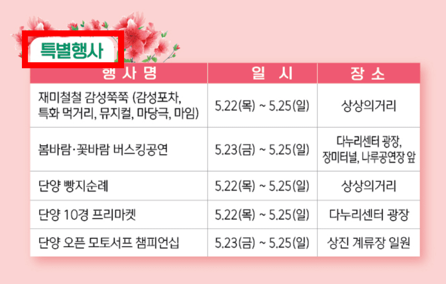 | 축제명 | 일정 | 장소 | 주요 프로그램 |