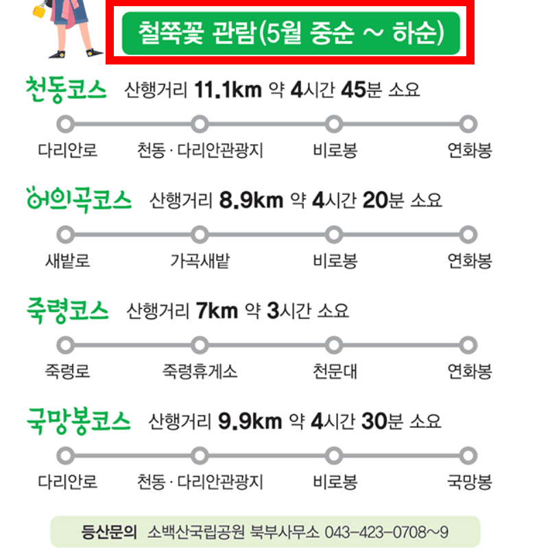 | 죽령코스 | 죽령탐방센터 | 연화봉 | 7km | 중 | 완만, 철쭉 군락, 가족 추천 |