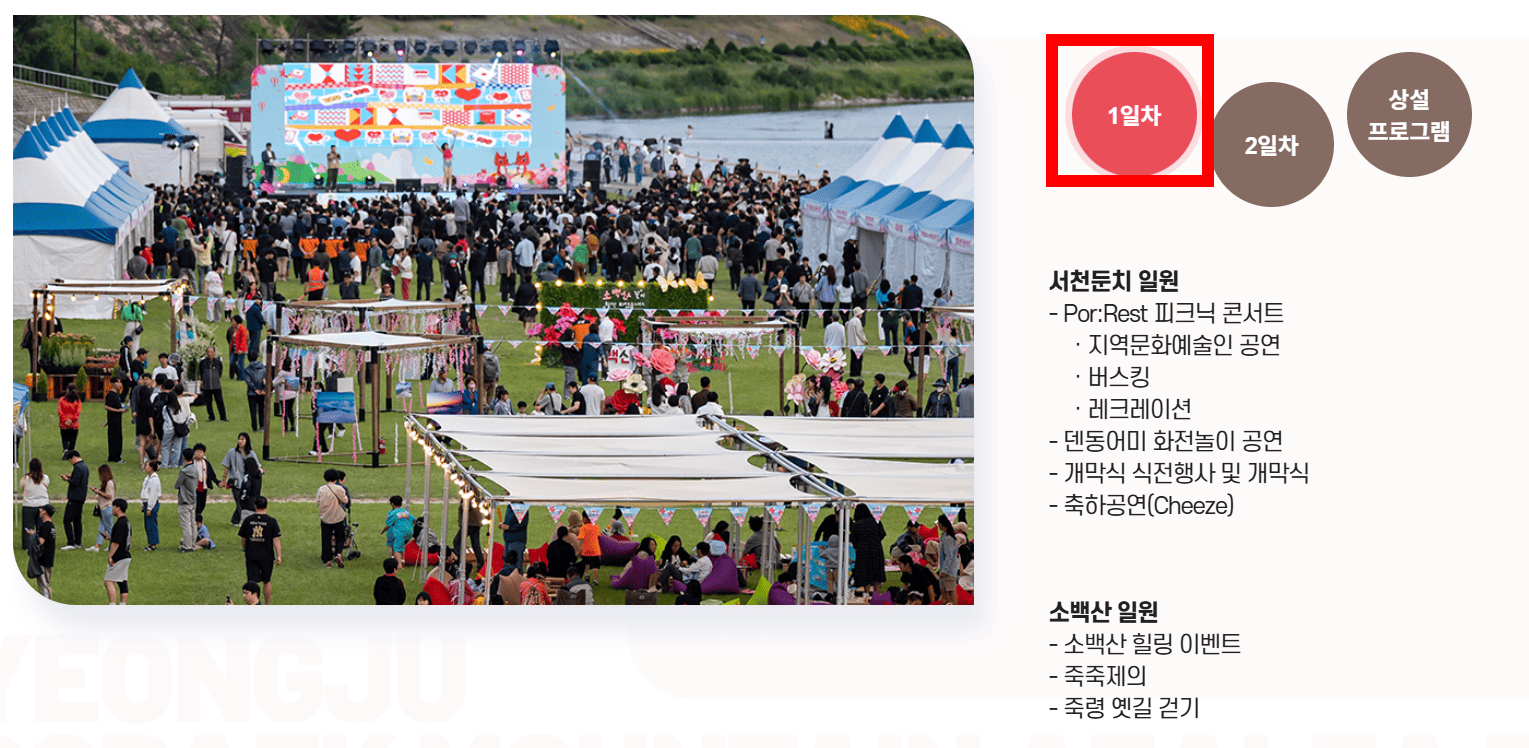 | 주차/교통 | 임시 주차장(축제장 인근) 및 무료 셔틀버스 운영 대중교통: 단양/영주역 하차 후 셔틀 또는 도보 이동 |