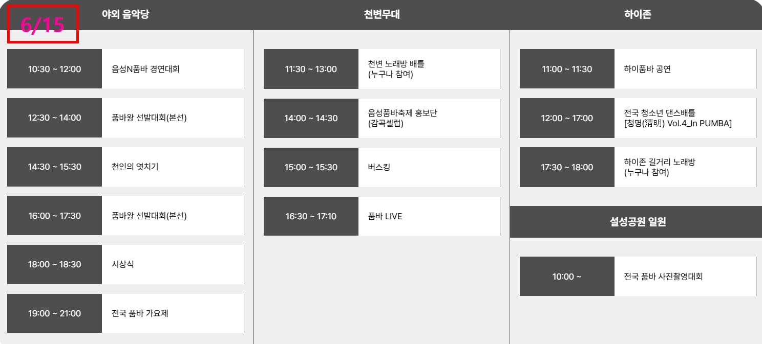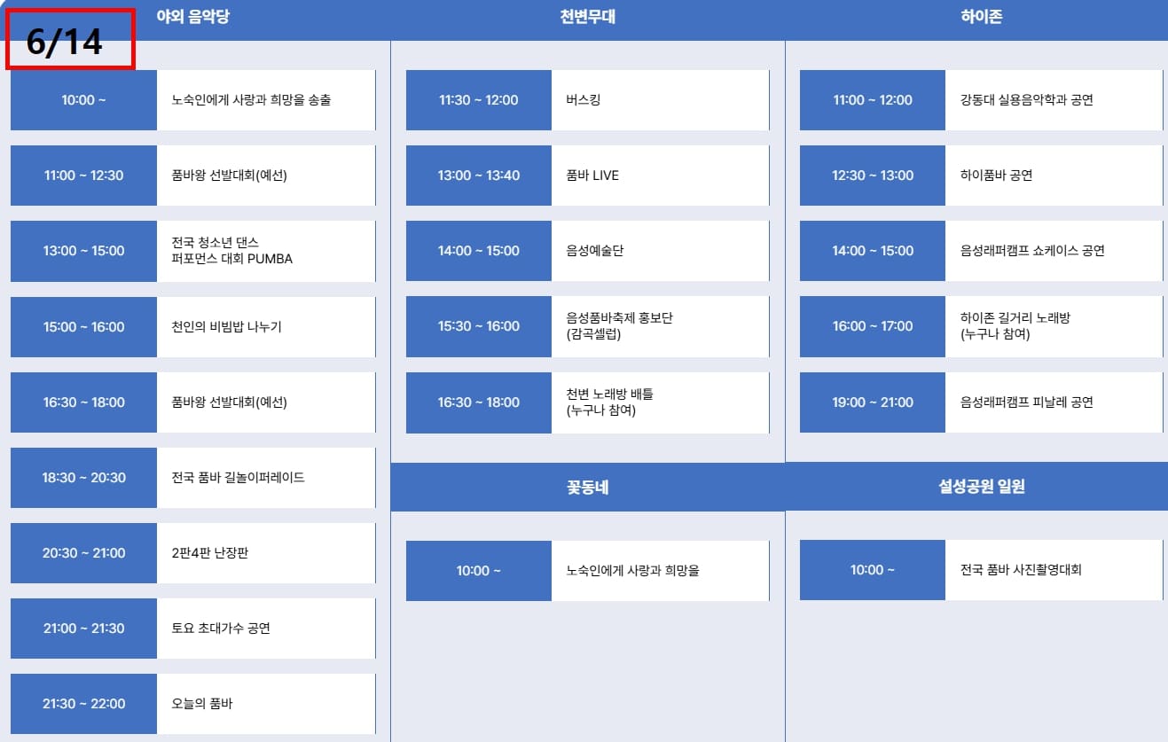 - 전국 품바 가요제: 전국 각지의 숨은 가수들이 실력을 겨루는 무대