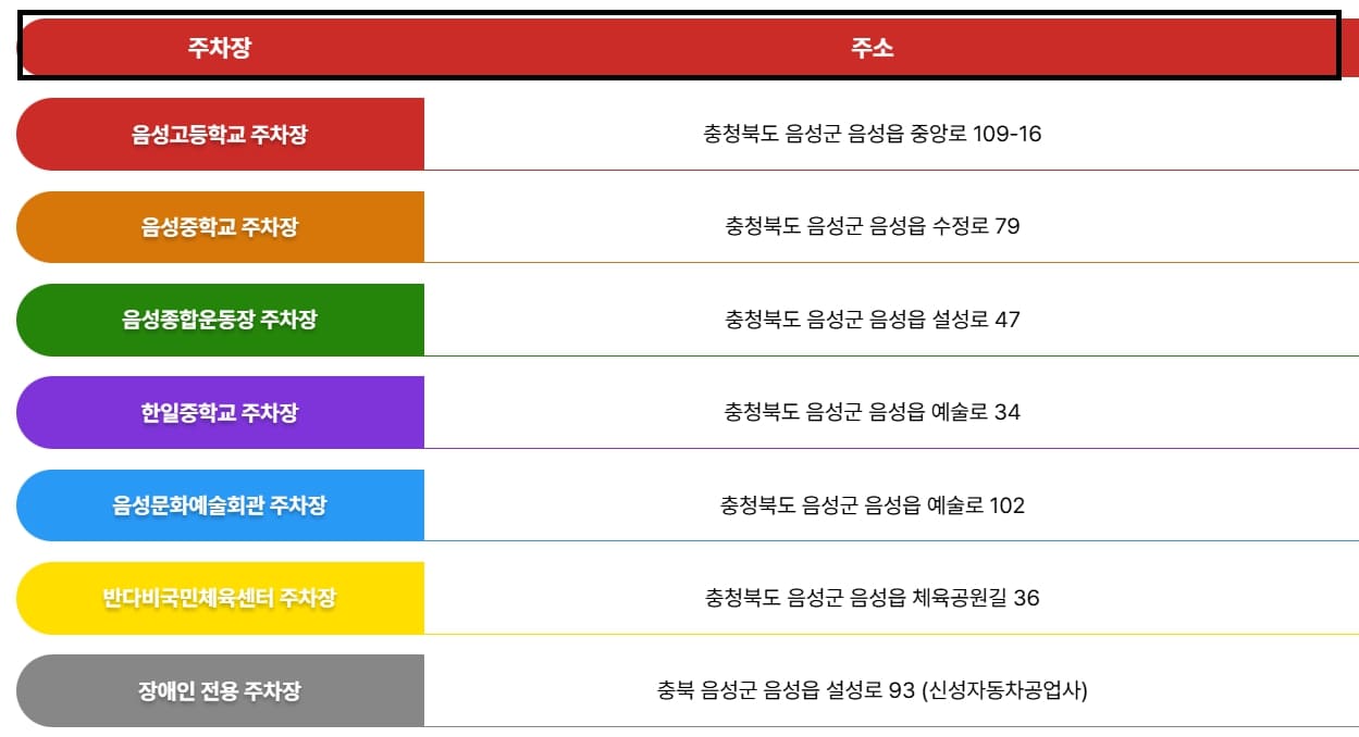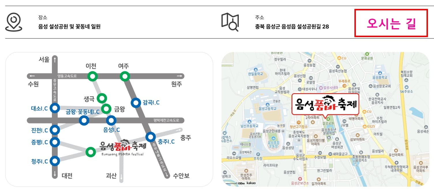 - 주요 내비게이션 검색어: “음성 품바축제”, “설성공원 주차장”