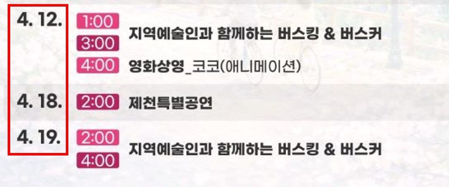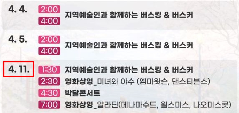 - 4월 4일, 5일, 19일: 버스킹 공연