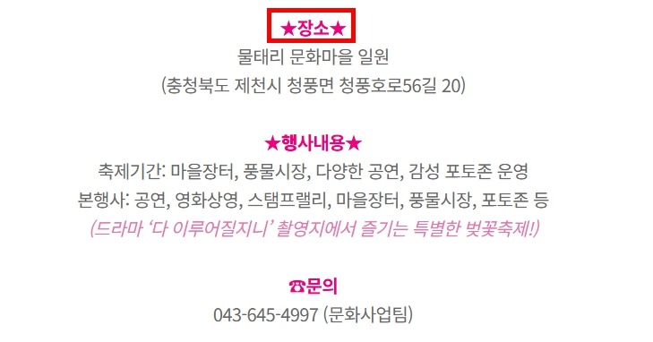 📍 장소: 충청북도 제천시 청풍면 청풍호로 56길 20 (물태리 문화마을 일원)