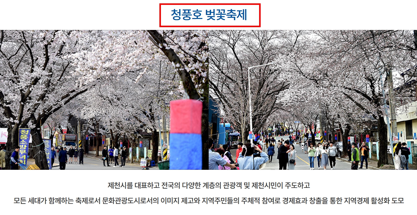 특히 제천 청풍호 벚꽃 축제는 공연과 영화, 야경까지 함께 즐길 수 있어 봄 여행지로 만족도가 높은 축제입니다.