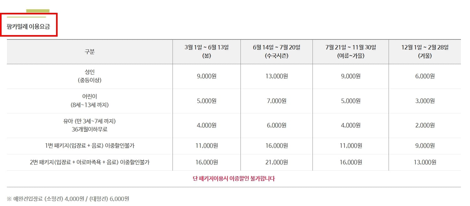 팜카밀레는 계절별로 입장료가 다르게 적용되며, 다양한 체험 패키지도 함께 운영하고 있습니다.