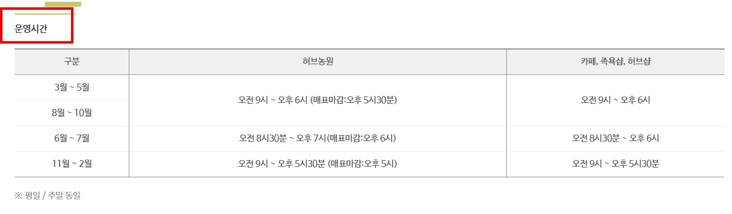 | 구분 | 봄 (3.1~6.13) | 수국시즌 (6.14~7.20) | 여름~가을 (7.21~11.30) | 겨울 (12.1~2.28) |