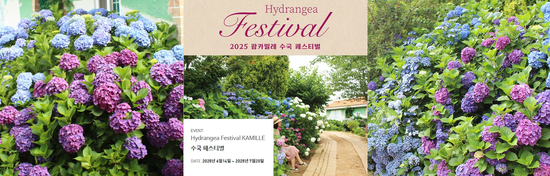 6월 중순부터 7월 초까지는 팜카밀레허브농원의 수국이 절정에 이르는 시기입니다.