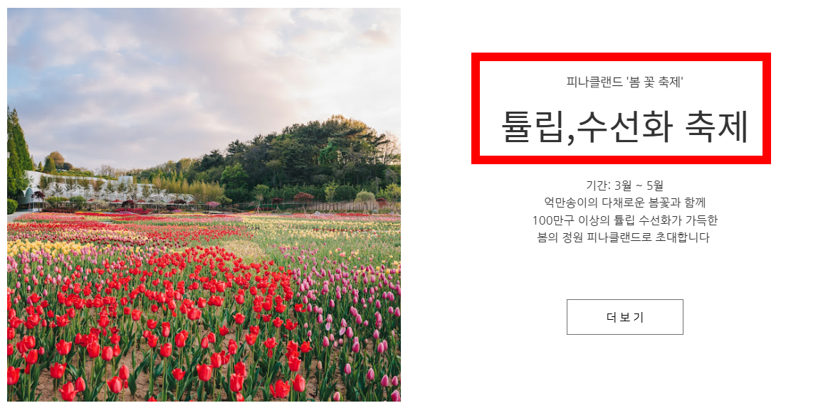 - 봄꽃 감상과 동시에 다양한 공연과 체험을 함께 즐길 수 있는 피나클랜드는 봄철 최고의 나들이 명소로 손꼽히고 있습니다.