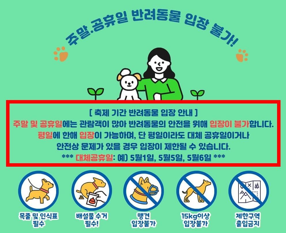 - 수목원 내 식물 채취, 흡연, 음주, 외부 음식 반입, 애완동물 동반은 금지되어 있습니다.