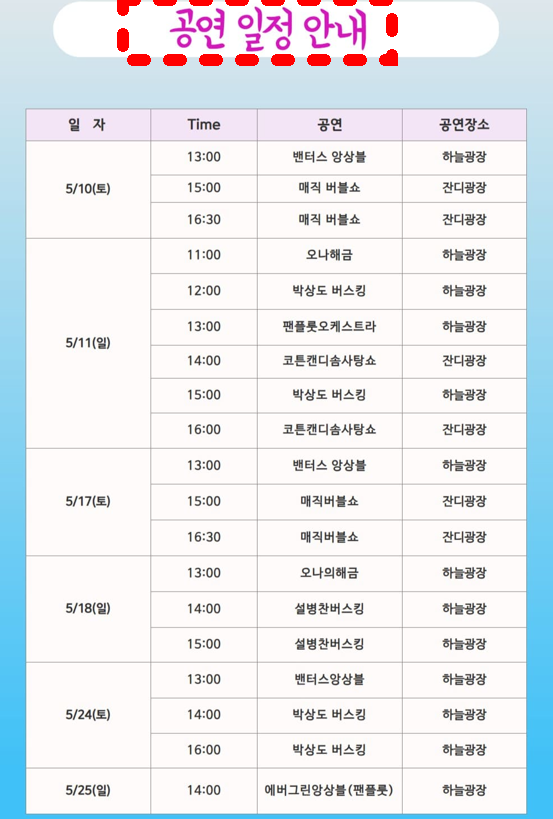 버블쇼, 마술쇼, 야외 음악회 등이 주말마다 열리며, 어린이 대상 체험 부스로는 알파카·사슴 먹이 주기 체험, 캐릭터 풍선 만들기 등이 마련되어 있습니다.